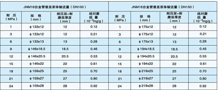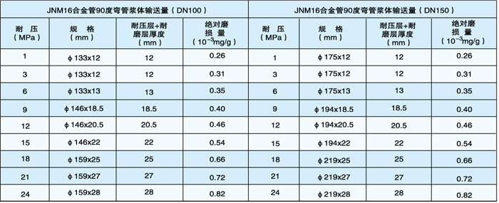 注:除表中所列規格尺寸外,高壓耐磨管件壁厚可根據磨損率和實際漿體輸送量增減。