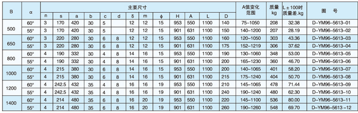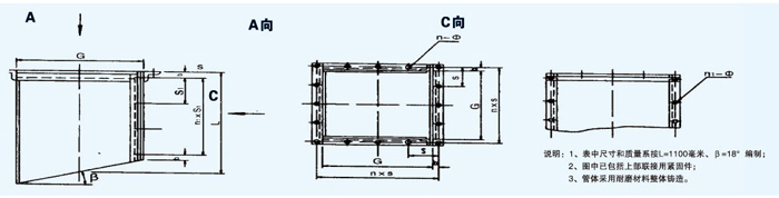 說(shuō)明:1、表中尺寸和質(zhì)量系按L=1100毫米、β=18°編制;2、圖中已包括上部聯(lián)接用緊固件;3、管體采用耐磨材料整體鑄造。