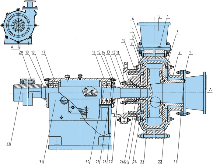軸封部分:軸封有兩種型式,副葉輪軸封及填料軸封。副葉輪軸封具有不稀釋礦漿、密封使用壽命長、密封效果好等優點。填料密封結構簡單,維修方便。